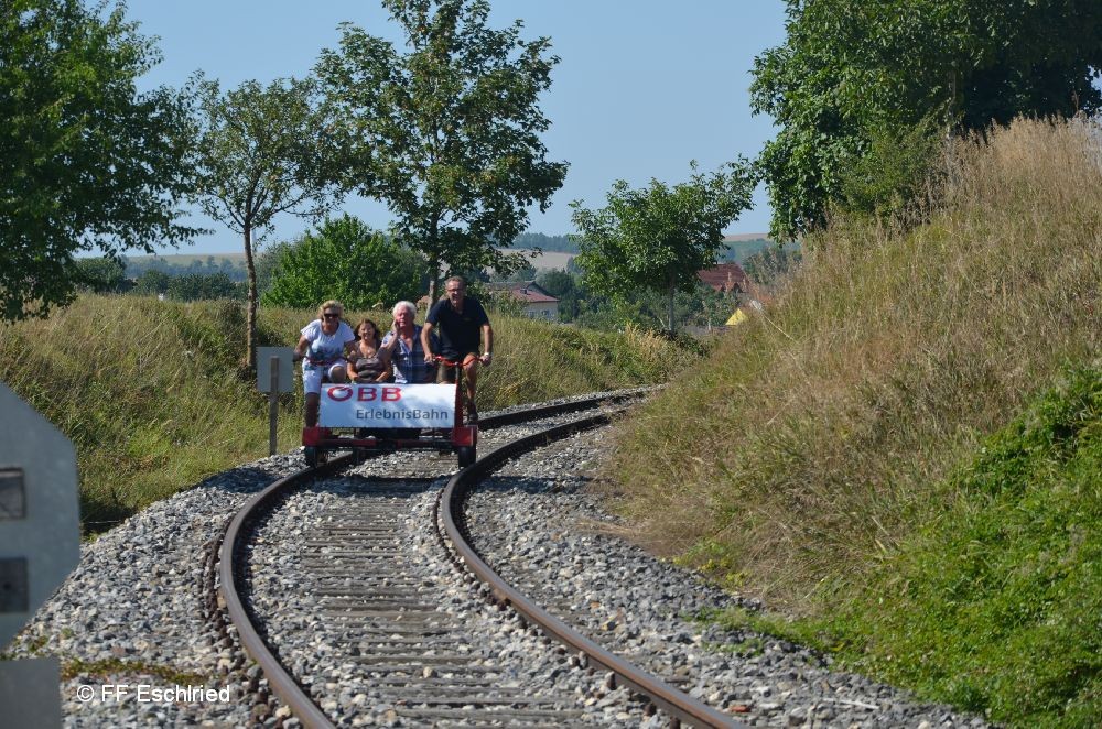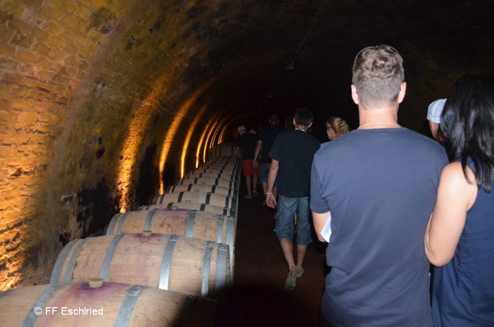 Unser erstes Ziel war Aspern an der Zaya. Dort angekommen wurde mit Draisinen auf einer aufgelassenen Eisenbahnstrecke in das ca. 12km entfernte Ernstbrunn gefahren. Nach einer Stärkung am Zielbahnhof ging es mit dem Bus weiter Richtung Wilfersdorf. Am Weingut des Fürsten von Lichtenstein bekamen wir eine Führung durch den großangelegten Weinkeller. Im Anschluss gab es verschiedene Weine zum Kosten.